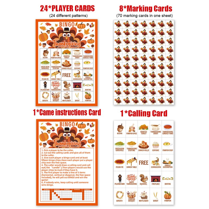 - 【Unique Pattern Design】:Thanksgiving bingo player card features on turkey,ear of rice,Corn Cobs,gift box and cupcake etc.lighting up festive atmosphere and bring lots of fun for Thanksgiving party.