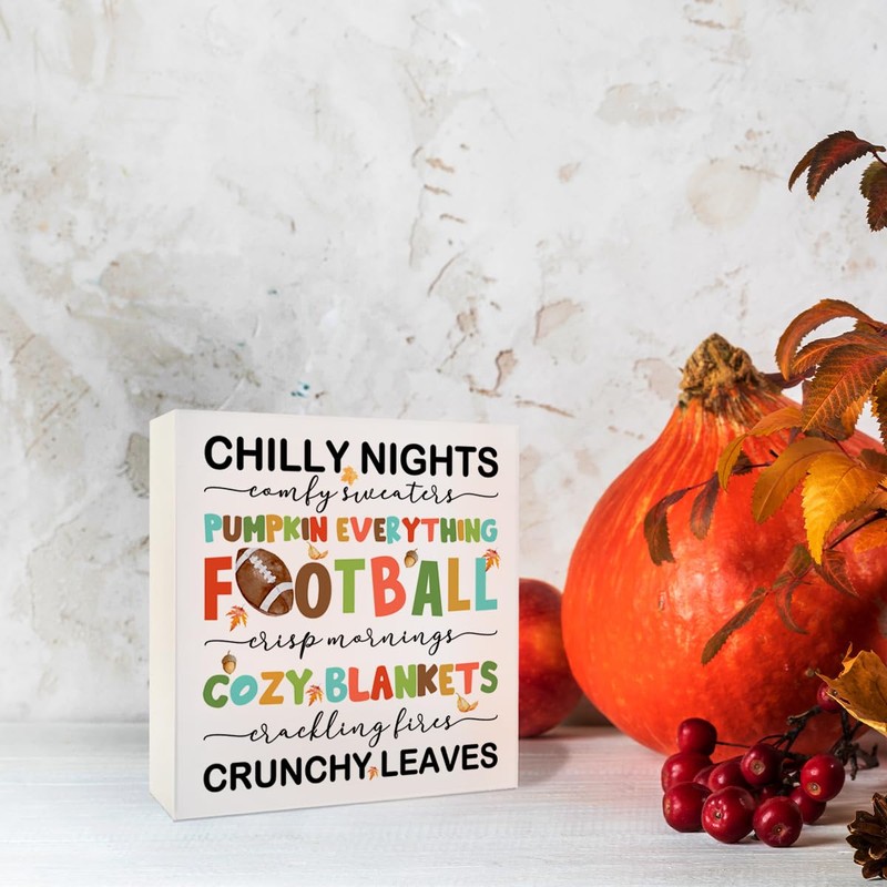 Fall Desk Decorations Wooden Box Sign, Fall Football Decor for Home Office Desk Table Shelf Harvest Autumn Thanksgiving Signs, Cozy Season