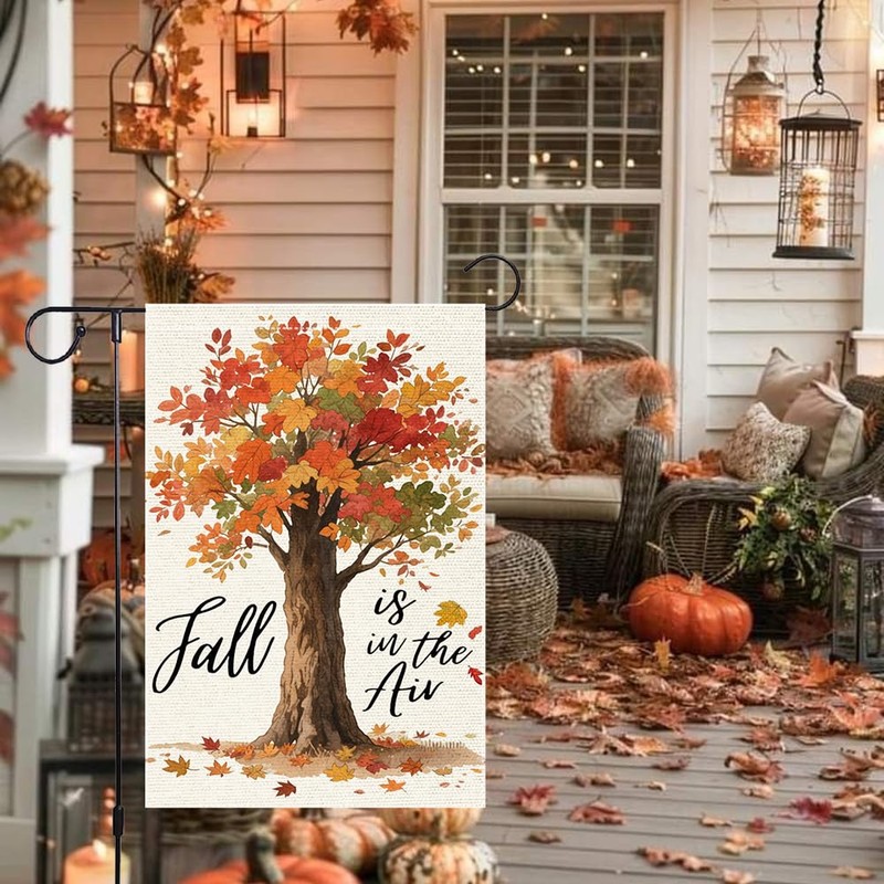 - Unique design:This garden flag depicts a large tree with watercolor strokes. Its lush branches and leaves present rich autumn colors such as red, orange, yellow and green, with autumn leaves scattered beneath the tree. On both sides of the picture, "Fall" and "is in the Air" are written in black artistic fonts respectively, and the whole picture is filled with a strong autumn atmosphere.