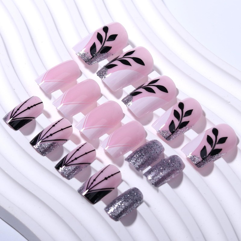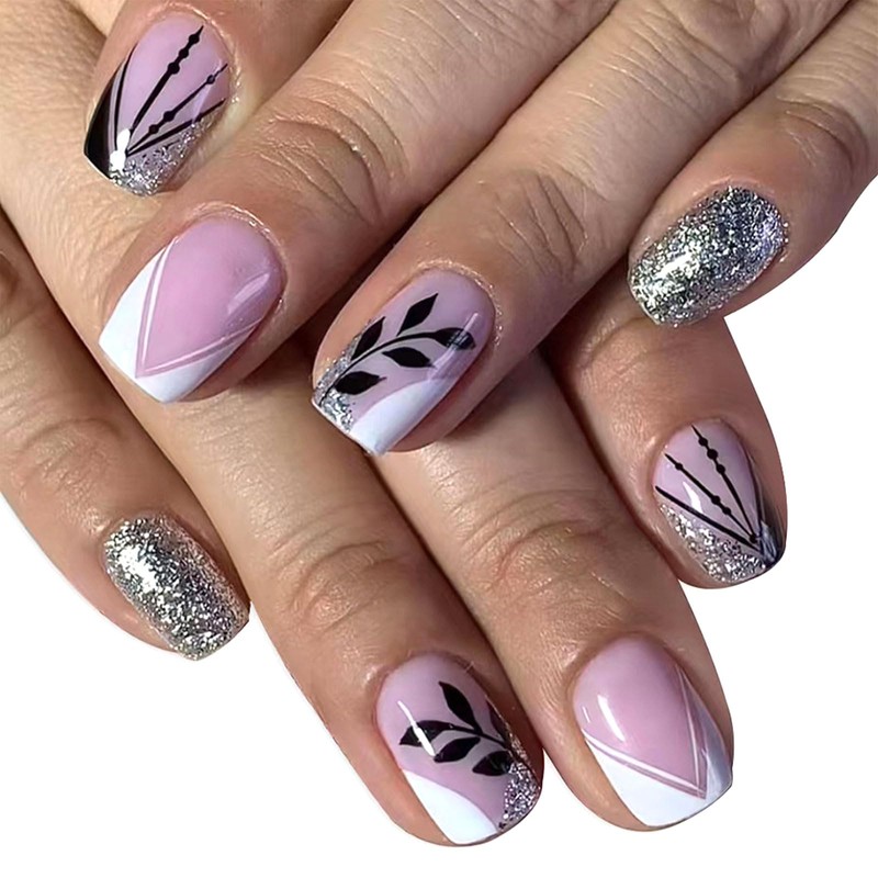 - ๐ ๐๐ฌ๐ก๐ข๐จ๐ง ๐๐๐ฌ๐ข๐ ๐ง: This fake nail features a classic black leaf and bamboo design, combined with a silver shimmering design, making the nails shine under the light, adding autumn elements and charm to your nails