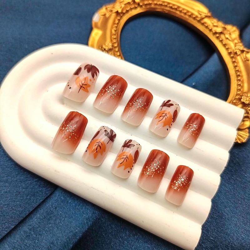 Fall Press on Nails Medium Fake Nails with Glitter Maple Leaves Designs Thanksgiving Nails Press ons Glossy Winter Orange Acrylic Gradient Autumn Stick on Nails Women 24Pcs