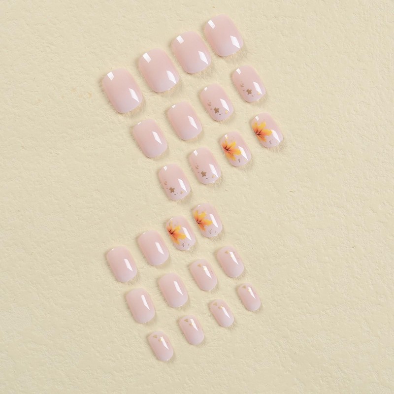 Fall Press on Nails Short, Maple Leaves Fake Nails Cute False Nails Pink White Acrylic Nails with Foil Design Autumn Leaves Artificial Nails Full Cover Stick on Nails Glossy Glue on Nails for Women