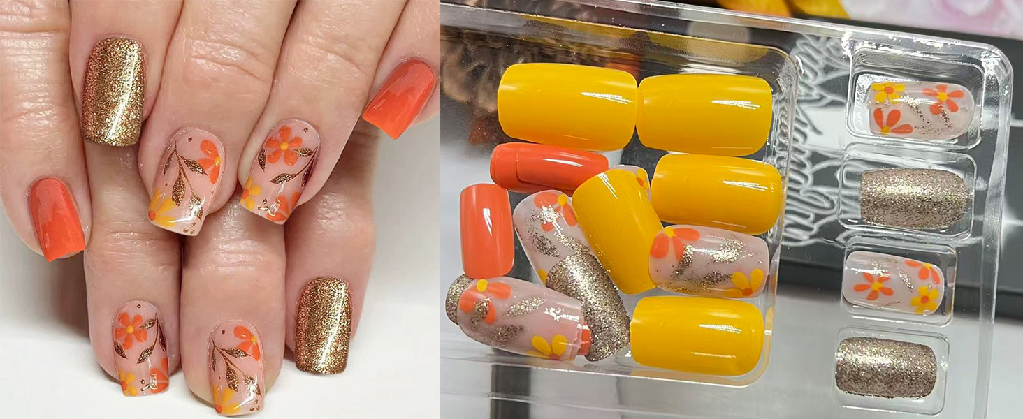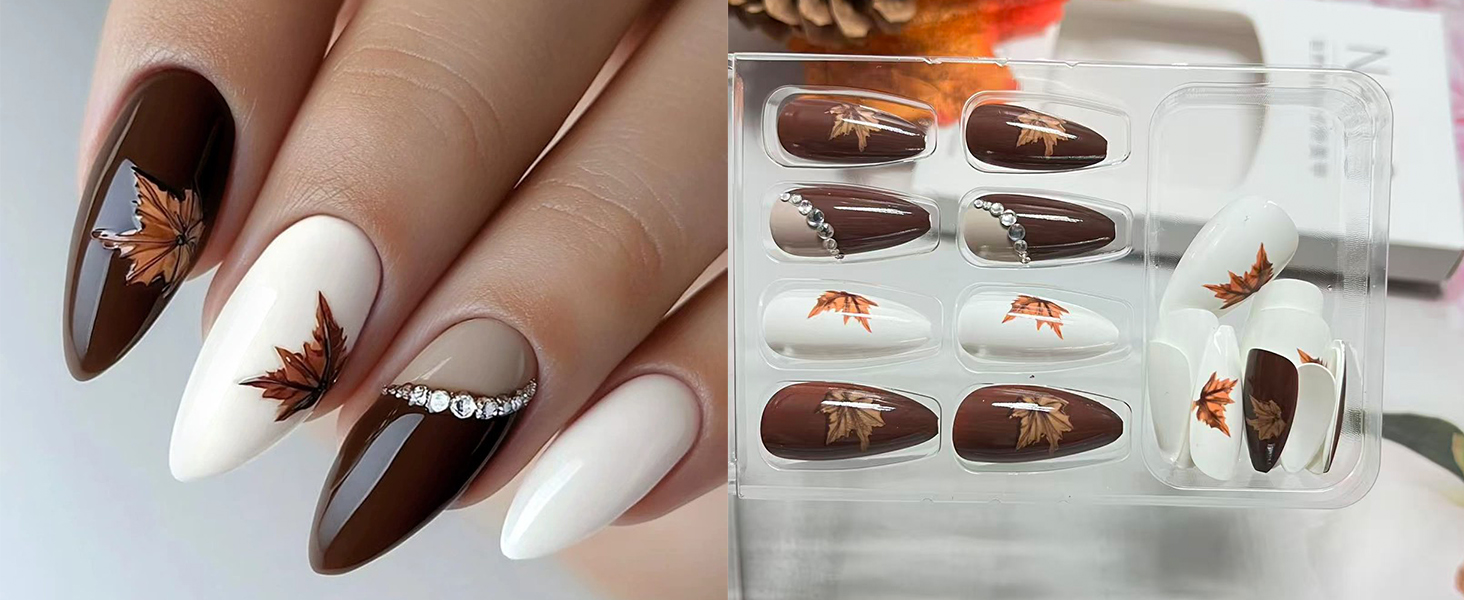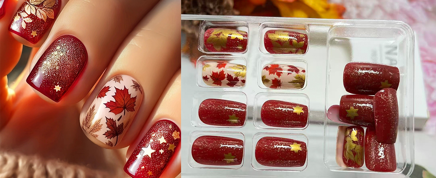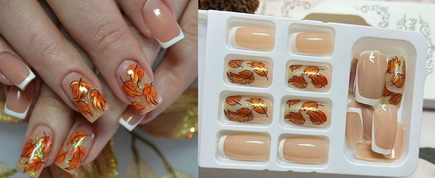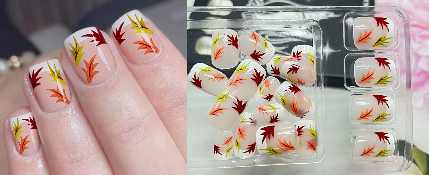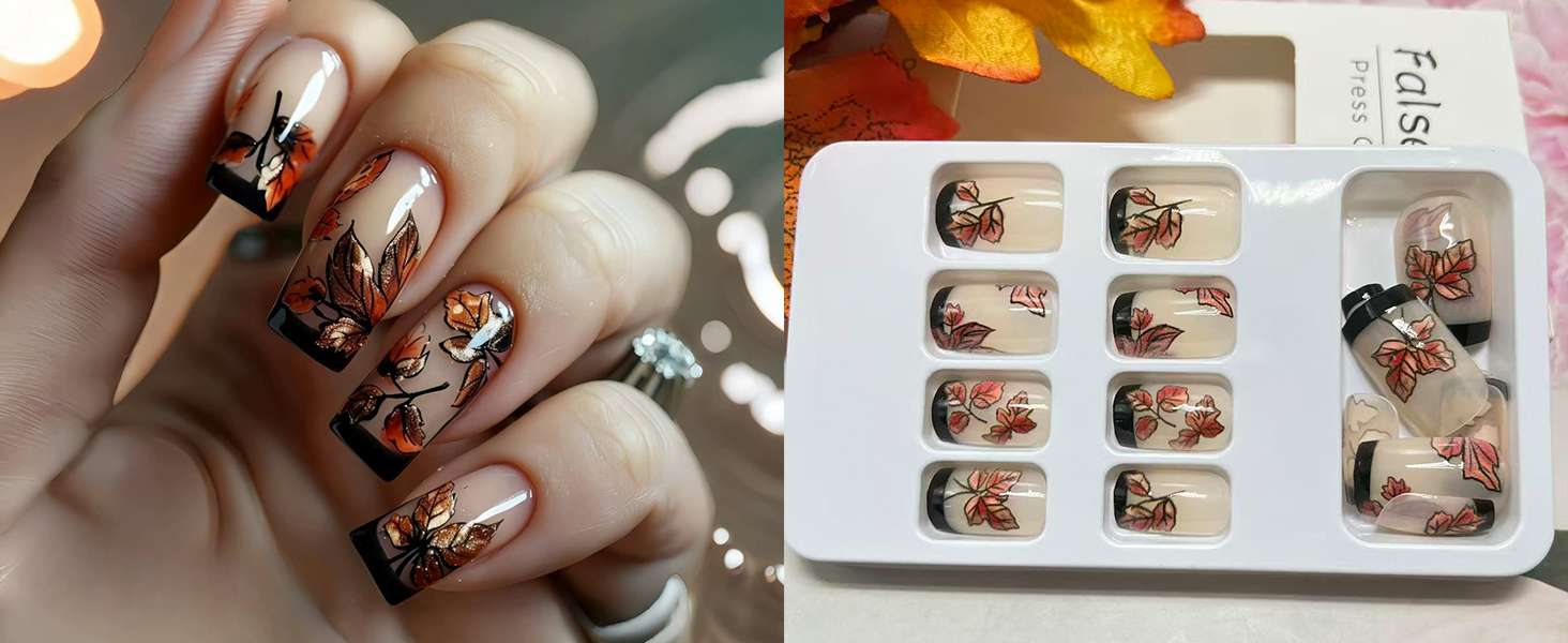 - High-Quality Materials: The fall leaf fake nails are made of ABS material, which is odorless,moderately thick, not easy to break, harmless to the human body and nails, and can be used with confidence