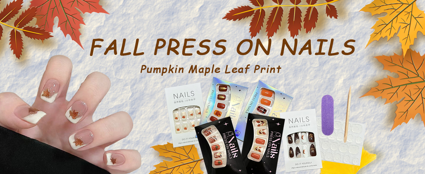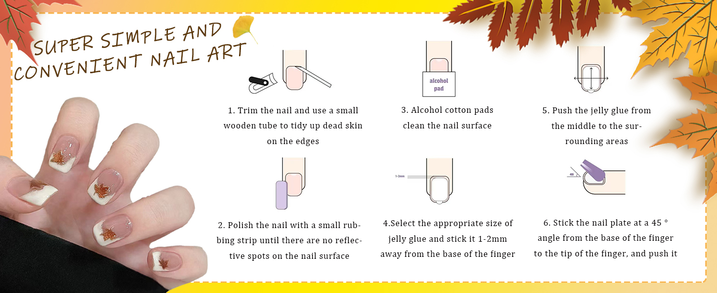 - Fall Glue on Nails Kit: The package contains 24 pieces of press on nails short of different sizes, 1 nail file,1 wooden stick and 24 pieces of nail glue stickers.(Jelly glue doesn't last as long as liquid glue, but it can make fake nails reusable. Please use suitable glue according to different occasions)