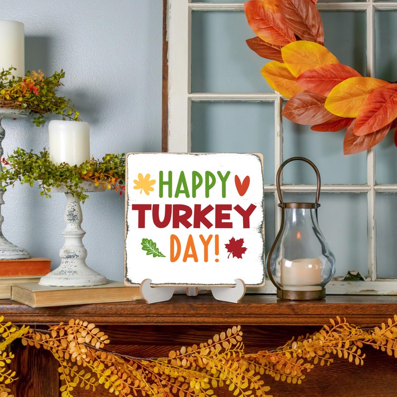 Fall Table Decor, Happy Turkey Day Wooden Plaque with Stand, Rustic Autumn De...
