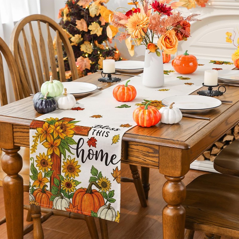 Fall Table Runner, Cross Pumpkins Runner for Table Bless This Home Seasonal Autumn Indoor Outdoot Party Decorations 13x60 Inch
