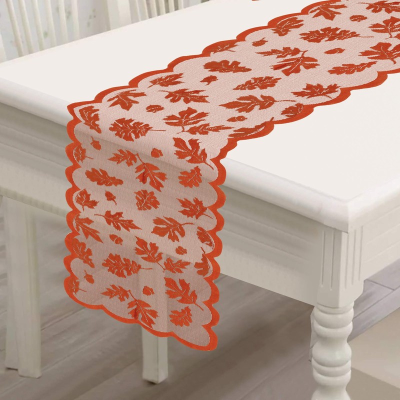 - Classic Design: Thanksgiving table runner with Classic Maple Leaf Pattern,chic scalloped edge and rust red background,Makes this tablecloth look very delicate and exquisite.