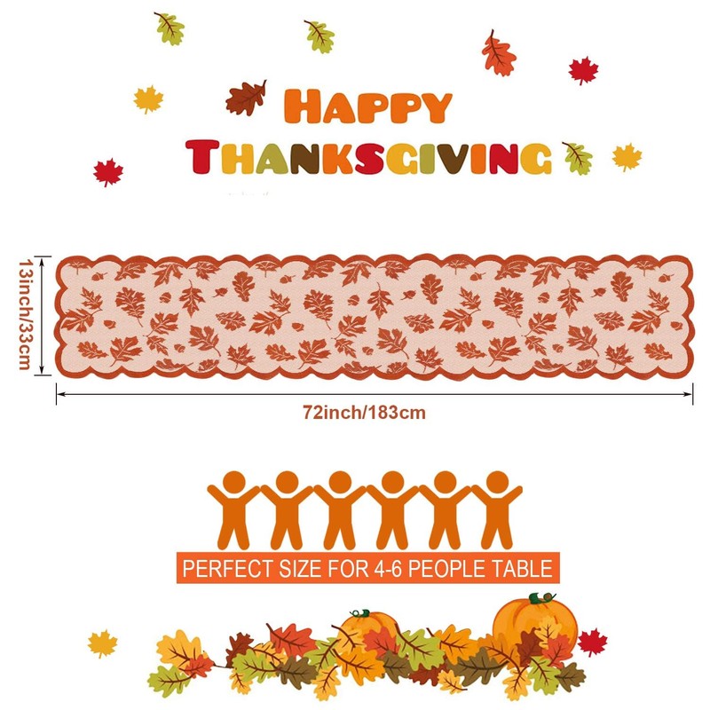 - Size: The size of this table runner is 13 inches x 72 inches, suitable for a 4-6 seat dining table. We provide 1 piece of identical table runner. If you have more relatives and friends coming over, we recommend purchasing two pieces together, which can accommodate tables for 6-12 people.