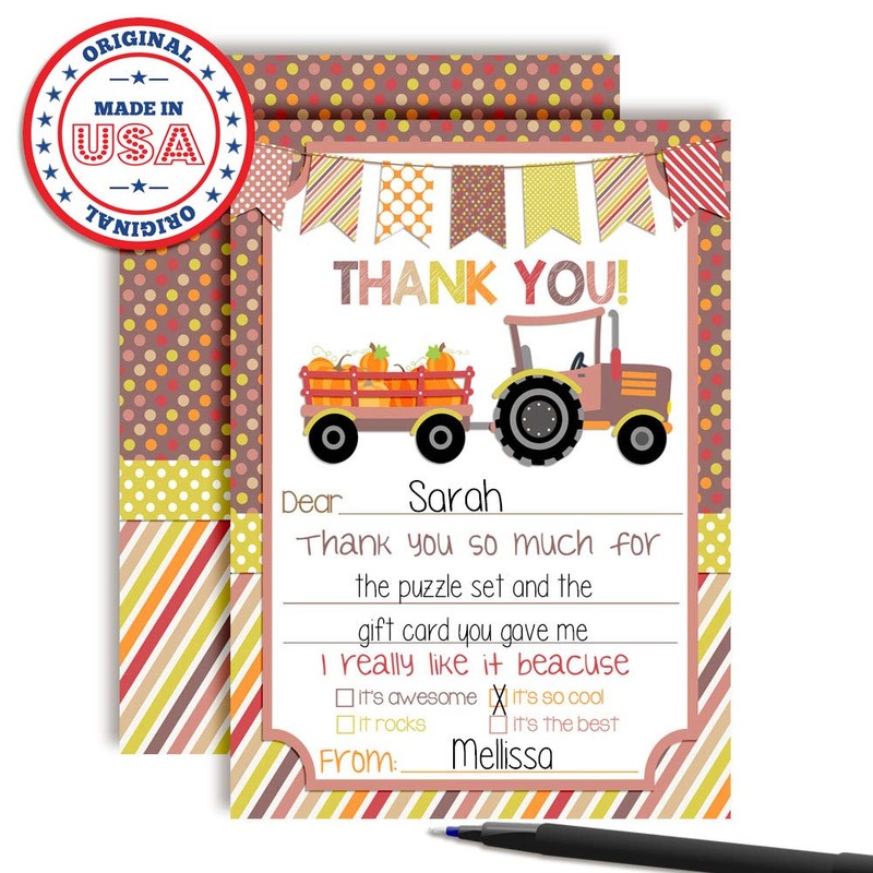 Fall Tractor with Pumpkins Birthday Thank You Notes for Girls, Ten 4" x 5.5" Fill in The Blank Cards with 10 White Envelopes by AmandaCreation