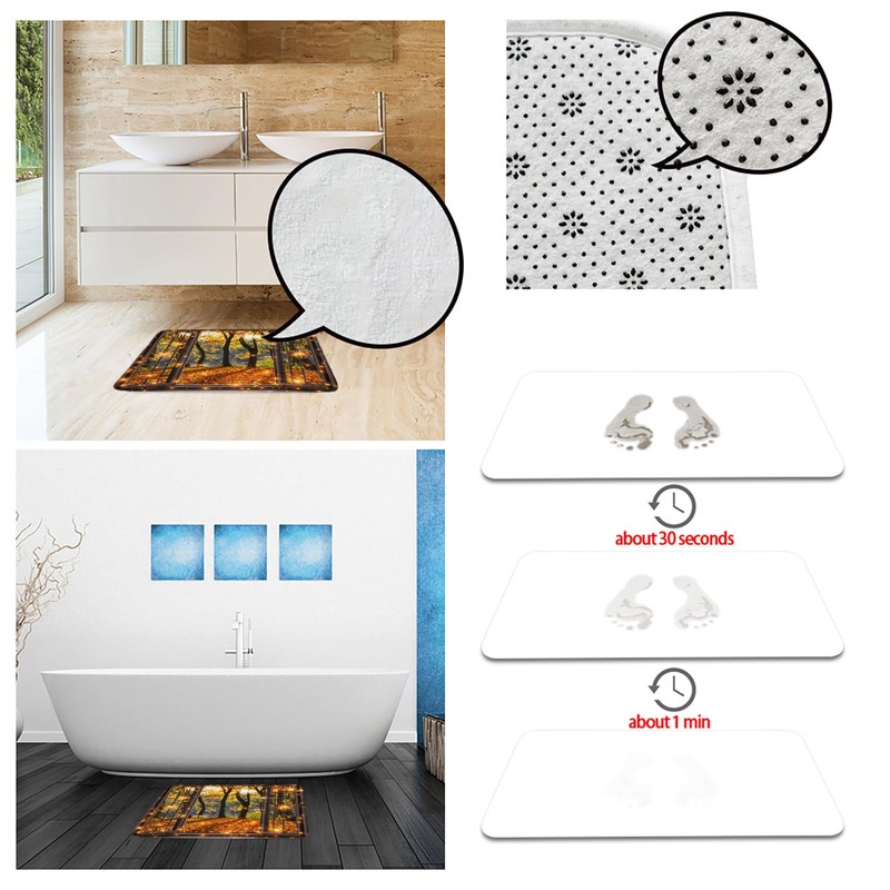 With so many benefits, our bath mat is suitable for any bathroom! Product description Material: Microfiber Memory Foam, Soft and Comfortable. Printed: 3D high-definition digital printing, no fading, clearer patterns. Machine Washable:Save Your Time-Machine wash in cold water on gentle cycle with a mild detergent, Tumble dry on low heat or lay to air dry. Color will not fade. Applicable Scenarios:The Rectangle Floor Mat Also Can Suitable For The Occation Of Door, Corridor, Hall, Sitting Room, Bedroom, Kitchen,Living Hallway, Floating Window, Under The Chair,Pet Mat,shower rug, kitchen sink rug, door mat, laundry room rug and etc.PERFECT-for all surfaces, backing will not harm your flooring. TIPS: Due to the foldable packaging, there will be creases when you get it. Put it flat by hand for a while and it will restore itself to its original state.Note: Due to the difference of computer monitors, there may be color differences between objects.We will try our best to ensure the best results. Thank you for your understanding and support.