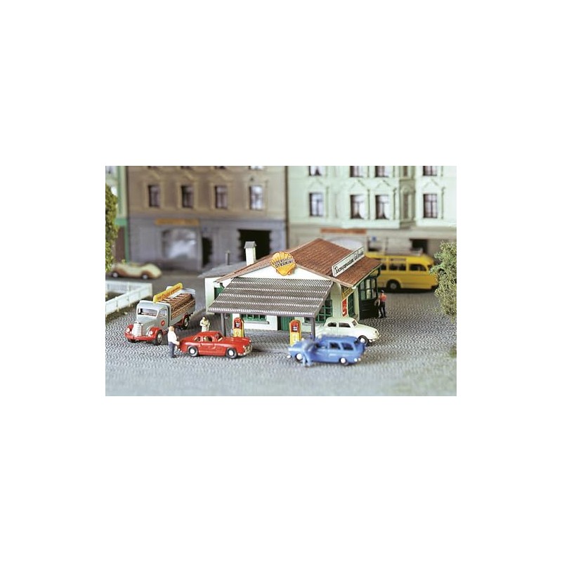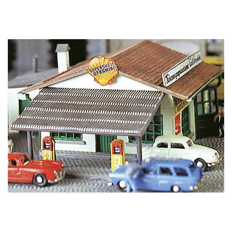 - Fifties style petrol station with covered petrol pump area and workshop. This building kit contains: 1 curtain mask and 1 assembly instruction. Verwenden Sie zum Basteln FALLER - Plastikkleber.