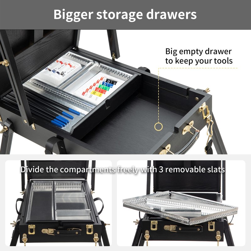 - Bigger Storage Drawer: Not like standard plein air box easel, they have to leave space keeping the legs, our updated easel can fold the legs on the sides, which will save one big full empty drawer to keep your tools and stuff; You can even divide the compartments freely with 3 removable slats to keep pigments or brushes organized, the top layer is made of aluminium, much easier to do cleaning when it's dirty.