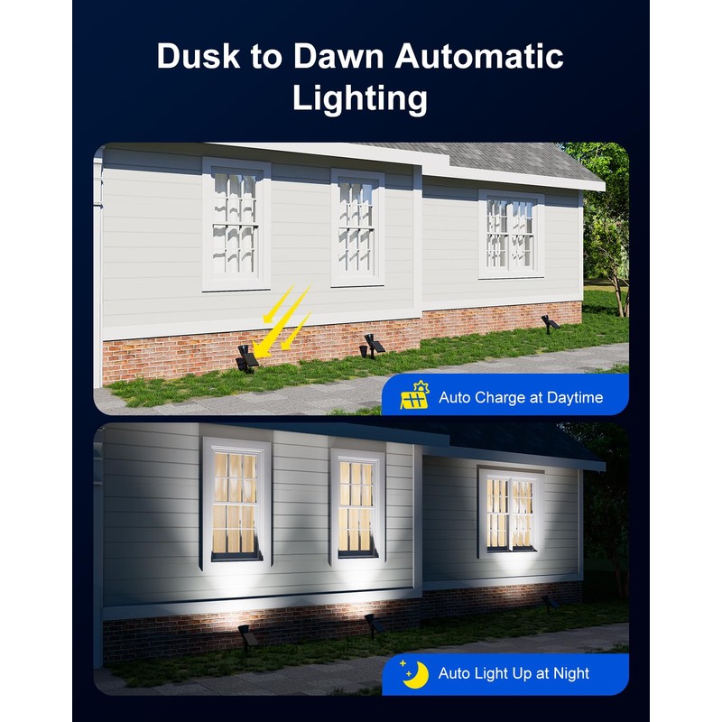 - Auto on at night / Auto charge at sunrise; 2 Level Brightness working modes.