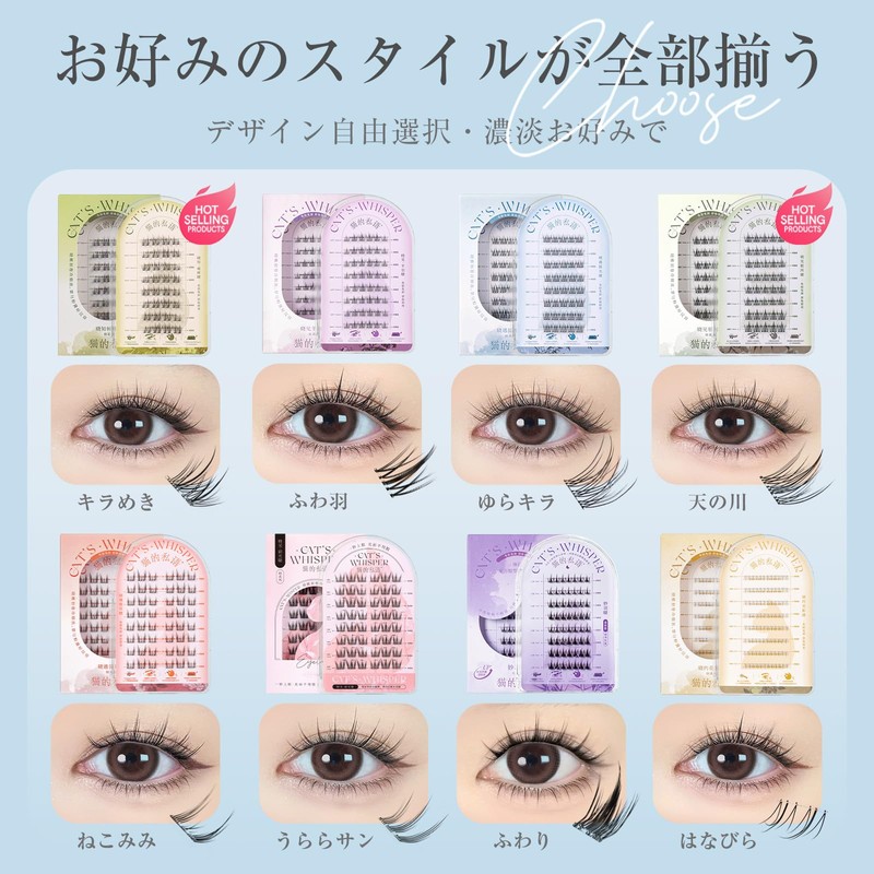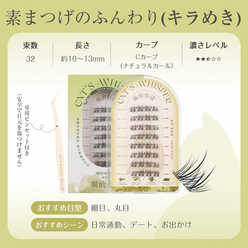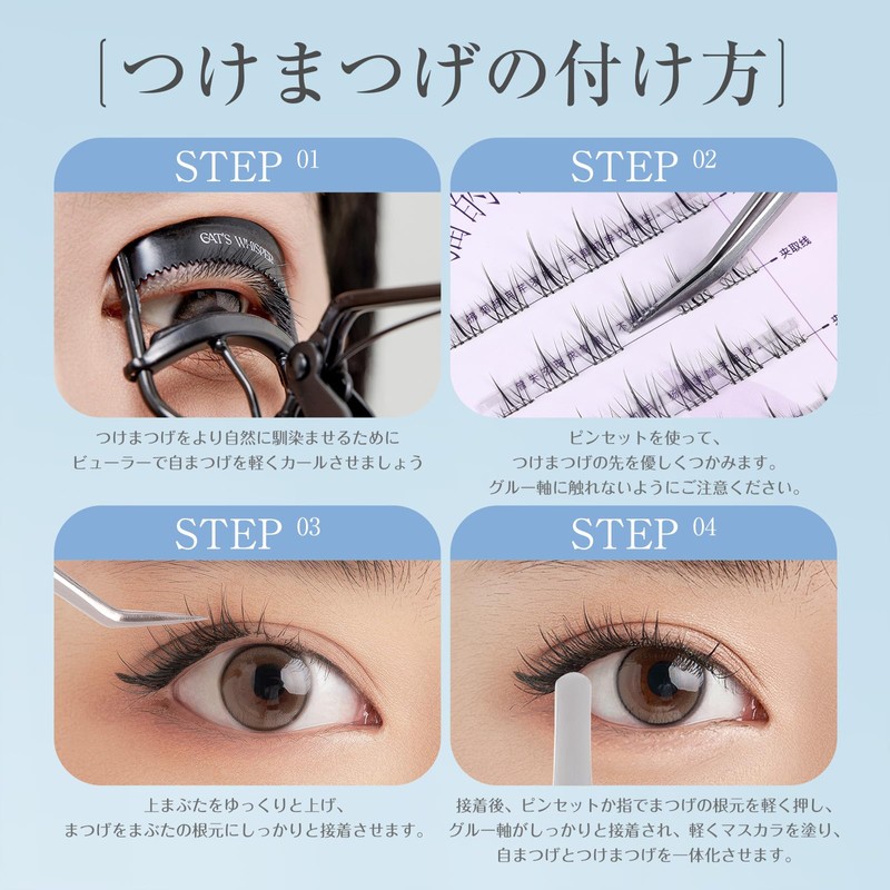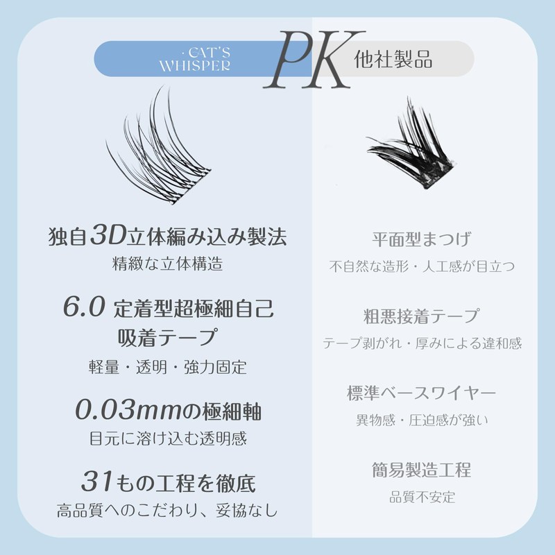 • No glue required false eyelashes - durable and long lasting: These eyelashes are made of high quality materials that do not require glue and are gentle on the skin. They are easy to put on even for beginners. You can DIY the eyelashes together as a set of 3 bundles, so you can adjust the number of bunches to match the shape of your eyes. Stays in place all day long and stays in place With its transparent shaft and high quality artificial hair, the CAT'S WHISPER false eyelashes are made with a transparent band that fits naturally around your eyes, giving it a finished look that looks like your own eyelashes. The hair quality is made with specially selected high-quality synthetic hair compared to other products, so it is fluffy and lightweight and comfortable to wear. Also, each piece is carefully handmade by skilled craftsmen with a delicate and beautiful finish. The natural yet exquisite design is designed to fit the eye of Japanese people, so it can easily be matched with any makeup, making your daily eye makeup more enjoyable