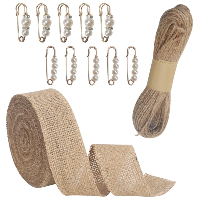 Package Includes: 10m burlap ribbon, 10 pearl pins and 20 meters of twine