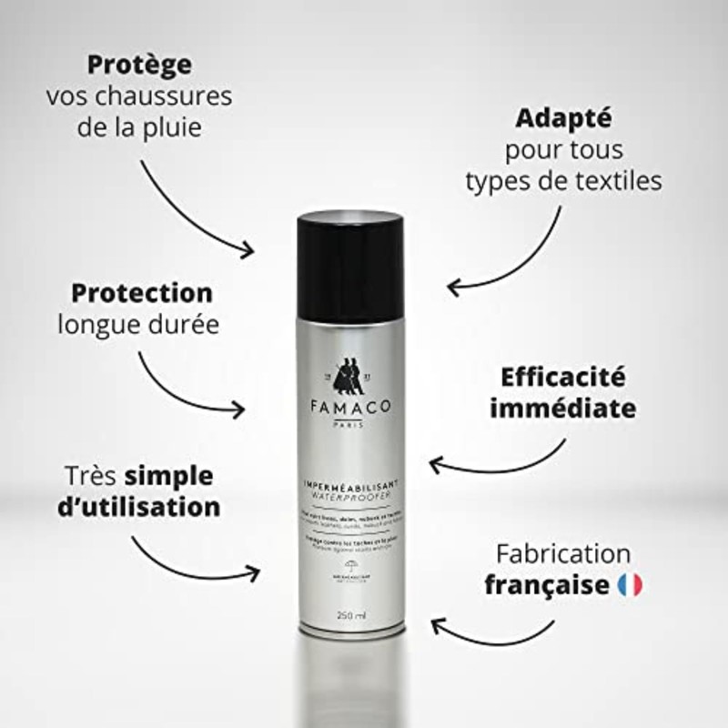 The well-known brand Famaco offers its impregnation spray in a 250ml and magnum version of 400ml to.This impregnation spray offers protection for water and stains. Suitable for Suede, Smooth Leather, Nubuck and textiles.