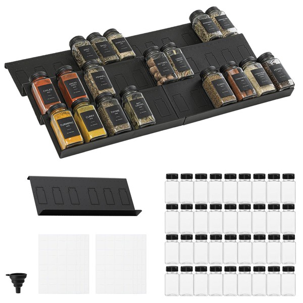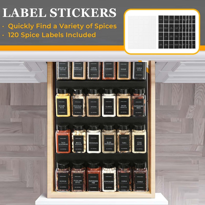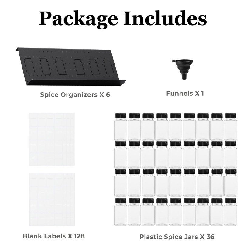 - Organize Your Spices: Each set contains 6 pieces of drawer spice racks, 36 square empty plastic spice jars, spice labels, and 1 funnel for a complete spice rack storage set for your kitchen drawers.