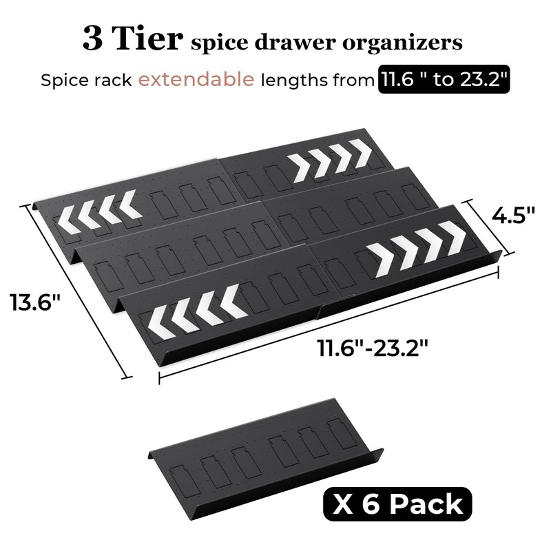 - 6 Drawer Spice Tray: This spice drawer storage set consists of 6 single slanted drawers that can hold up to 36 spice jars. Seasoning drawer organizer can extend from 11.6" to 23.2". Adjustable spice rack organizer for drawer compatible with most kitchen drawers . Please measure your cabinet or drawer before purchasing to ensure this drawer organizer suits your needs.
