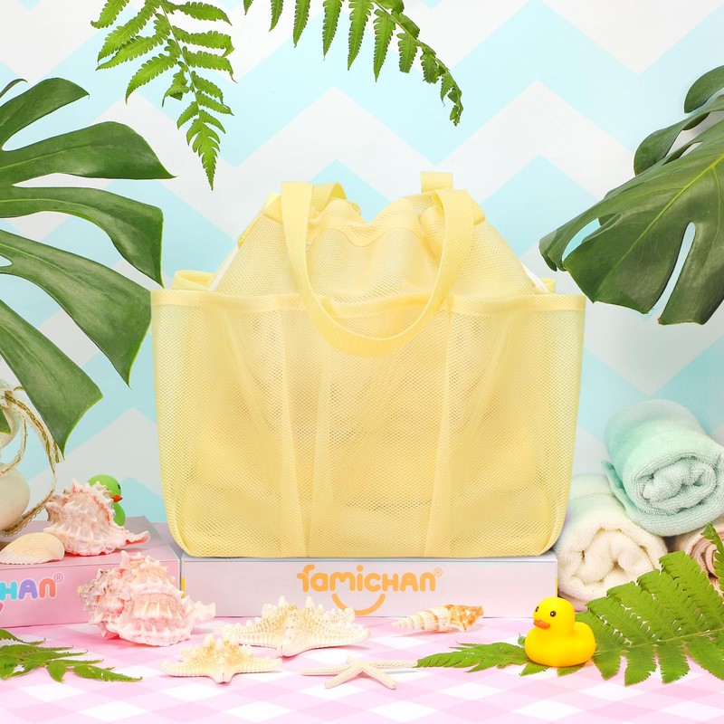 famichan Mesh Shower Caddy Portable with Drawstring, Dorm Room Essentials for College Students Girls & Boys, Large Shower Bag for Camping,Swimming,Gym,Travel,Bathroom - Yellow