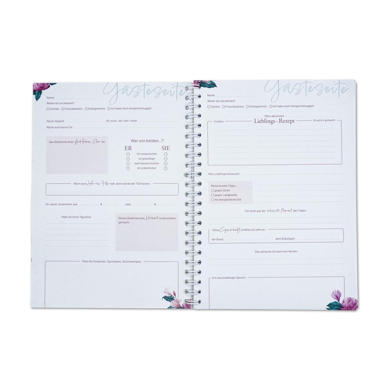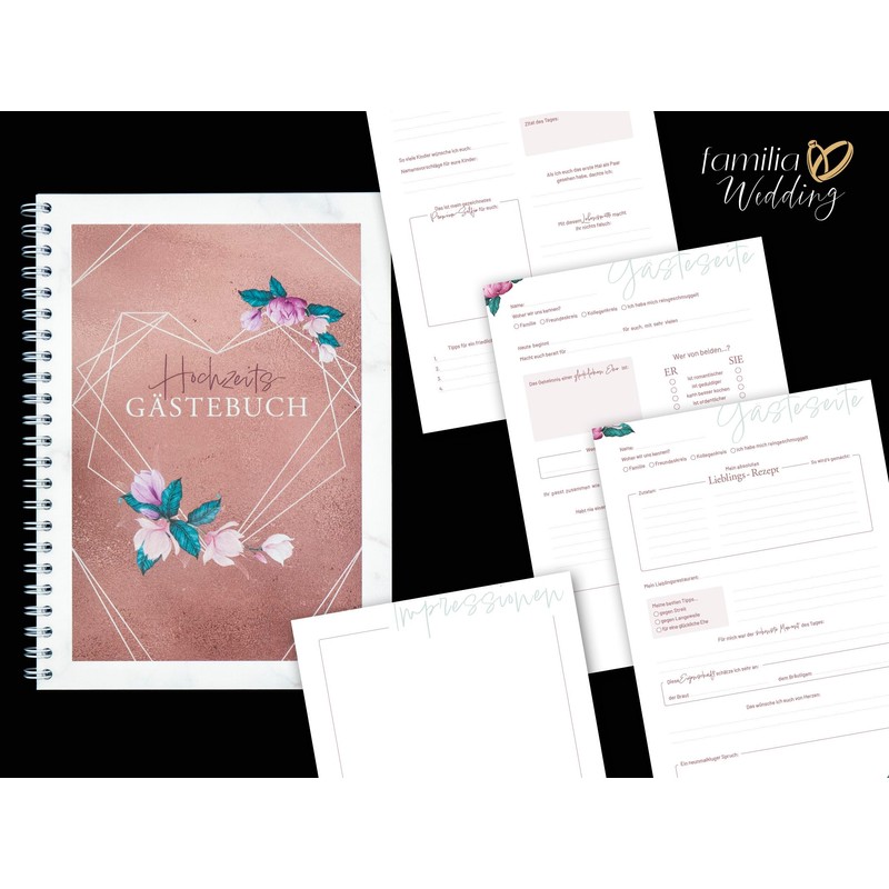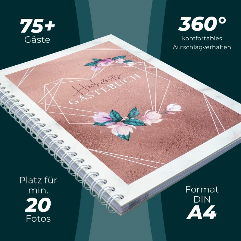 - - The enchanting rose gold flower design as a DIN A4 guest book for weddings with cheerful questions inside. The questions in the wedding book guide at least 75 guests through a rosy time and sayings about the bride and groom. BR10