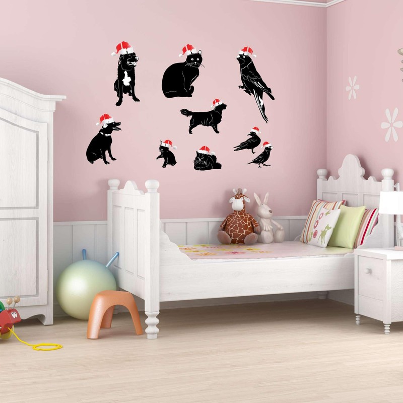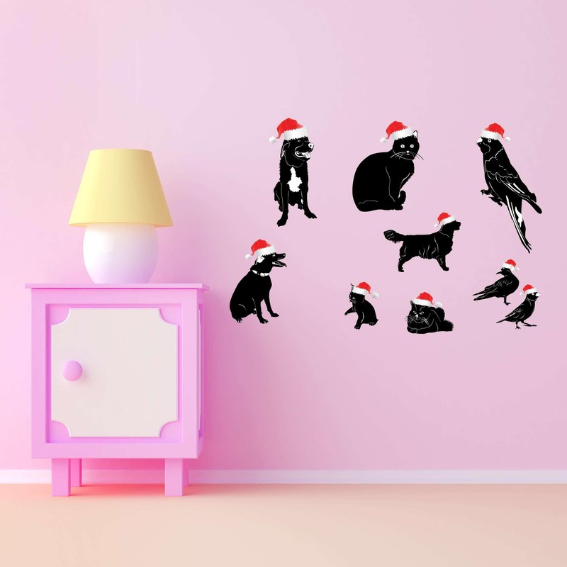 Family Adorable Cartoon Wall Decal Decoration Cute Animals in Santa Hat Christmas Hats Cat Dog Birds Lasts Years and Easily Removable - Size: 40 in(W) x 28 in(H)