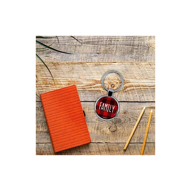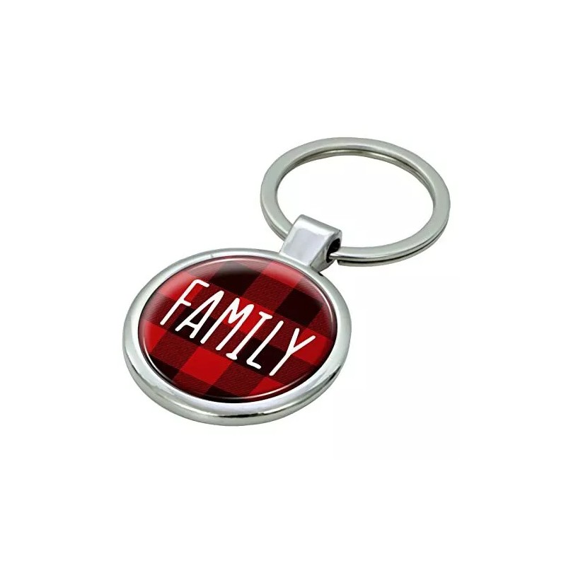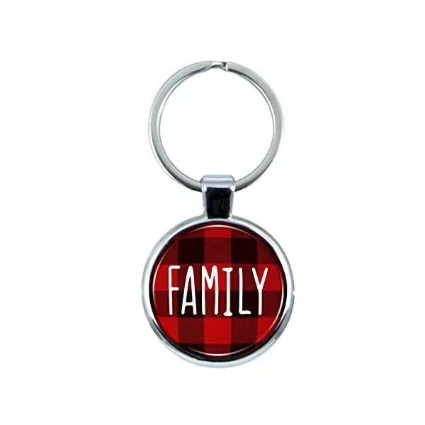 Family Christmas Red Plaid Keychain with Epoxy Dome and Metal Keyring