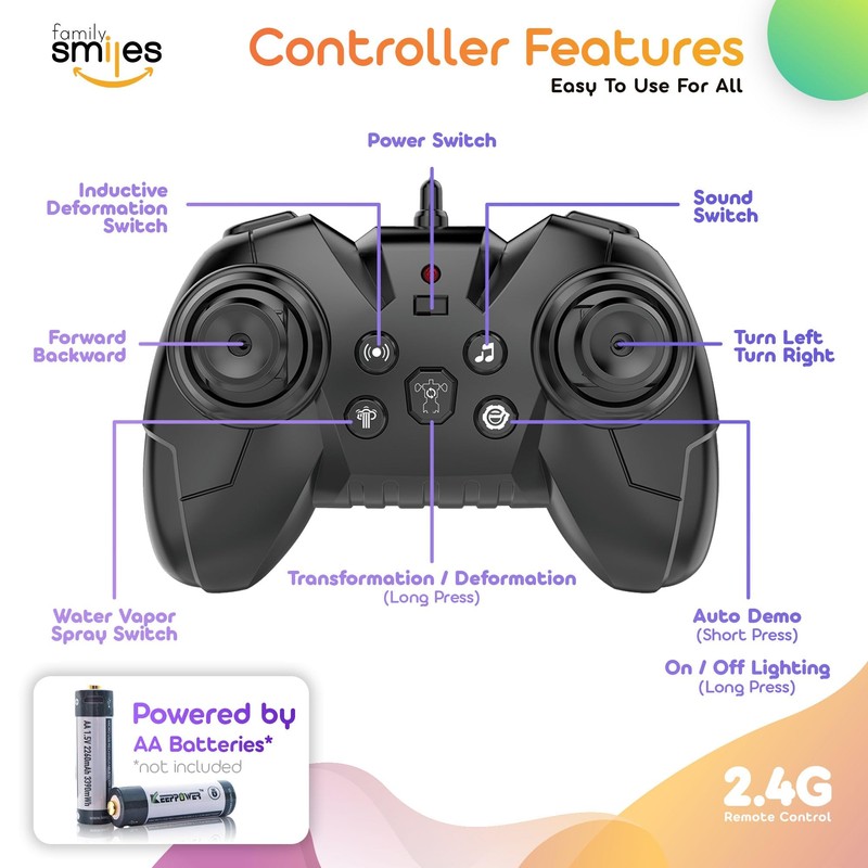 Let Family Smiles RC Toys Save the galaxy from evil with your very own RC Toy remote control Transforming Robot Warrior! Race to the fight in vehicle mode and spin 360 degrees to face your enemies no matter where they are, then with the push of a button you can transform from Super Sports Truck to Robot mode complete with electronic lights and sounds. Equip the included sword and shield accessories and your Remote Control Transforming Robot Warrior is ready for battle. With a 27 Mhz remote control and a 100’ range, you can take the fight to the bad guys wherever they may be lurking. Once you’ve defeated the forces of darkness, celebrate by activating Dance Mode, complete with flashing xenon lights, dynamic music and multiple dance moves! ABS Plastic 27 Mhz Remote Control with 100’ Range Remote Requires 2 AA batteries (not included) Transforming Robot runs on 3.7V LI-PO Battery Pack (included) Product size: Truck: 8” L x 4.5” W x 5.5” H ( in ) Robot : 5.5” L x 6 1/4” W x 7.5” H ( in )