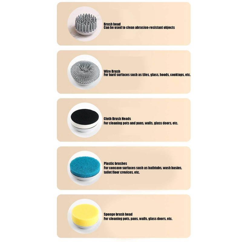 Versatile Brush Heads: With 5 different brush heads, our scrubber allows you to easily clean different surfaces without any hassle. Whether it's tiles, bathtubs, stoves, sinks, dishes, or cookware, this electric scrubber is the perfect tool for all your cleaning needs.