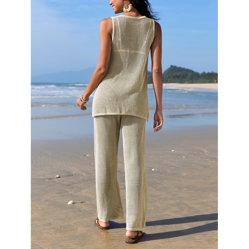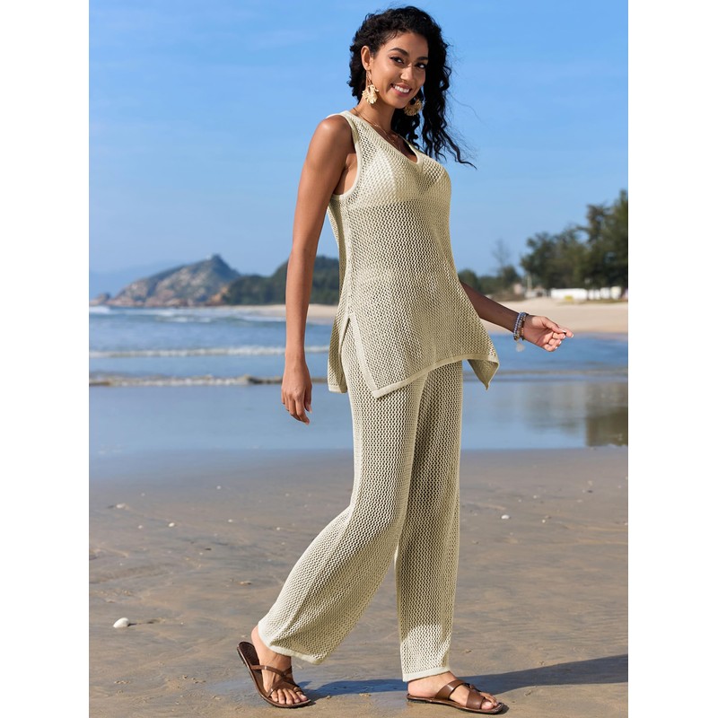 Famulily Beige 2 Piece Cover Up for Women Hollow Out Fishnet Outfits Set Solid Sleeveless Tank Top Wide Leg Pants Sets Beige M