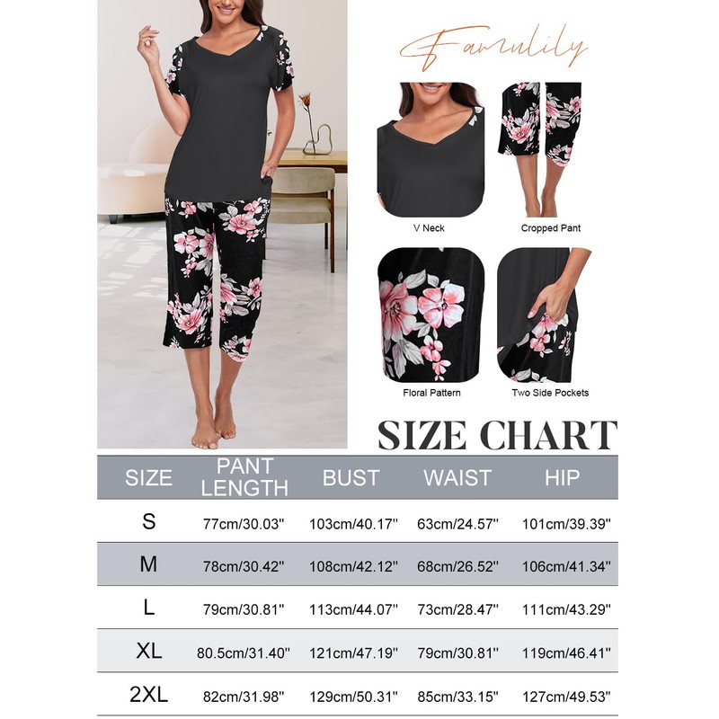 - Features: Womans two piece pyjamas set, ralgan sleeve v neck top , matching with floral printed capri pants, elastic waist with drawstring easy to ajust,two side pockets for your convenient.