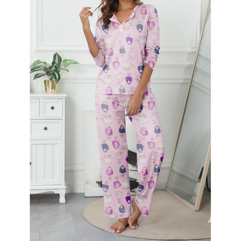Famulily Pyjamas for Women Sheep Printed Long Sleeve Tops Color Block Comfy Bottoms Henley Neck Pajama Sets Pink M