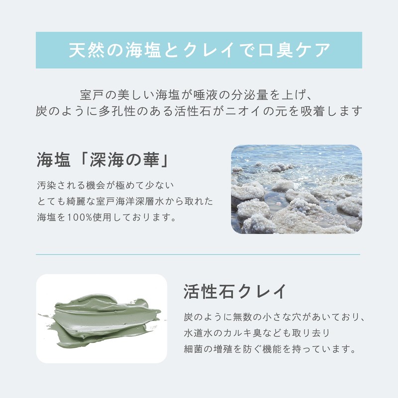 - (Natural Salt & Natural Clay for Breath Care) This clay is made with very beautiful natural sea salt of Tohoku water and precious active stones that can only be removed in the mountains of Tohoku to maintain its dirt and taste