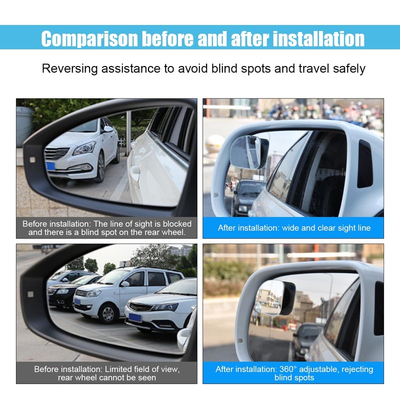 The high-definition glass curved blind spot mirror is frameless has a slim design, is waterproof and rust-proof, and has a double-sided adhesive backing that can be firmly adhered to and will not leave traces when removed. And it has 360-degree rotation and swing functions to maximize the wide-angle view inside the car.