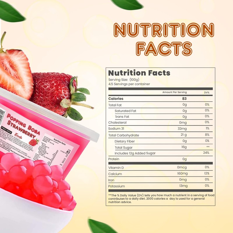 • ✅ Enriched with Strawberry Flavor: The fruit boba pearls are filled with natural and organic strawberry goodness. You get a juicy, mouthful taste of strawberry with every bite and slurp of your favorite beverages.