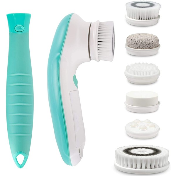 Fancii 7 in 1 Waterproof Electric Facial & Body Cleansing Brush Kit with Handle and 6 Brush Heads - Best Advanced Face Spa Scrub System (Aqua)