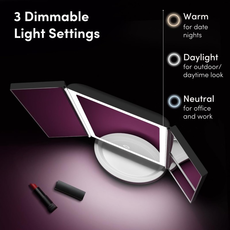- Tri-Color Lighting - 2x brighter illumination than similar models. 3 LED light settings (warm, neutral, and natural daylight) with dimmable brightness ensure that your makeup is flawless and color-correct under any lighting.