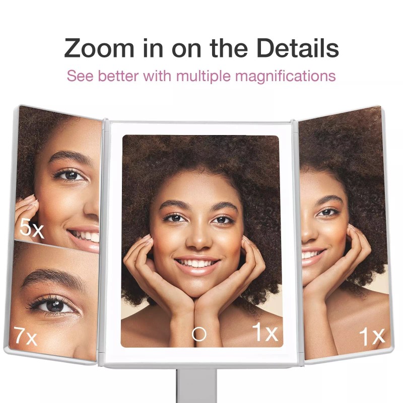 Natural Daylight. Natural You. 40 ultra bright, energy-efficient LEDs mimicthe effects of natural sunlight. Our daylight LEDs are 2x brighter and hassofter illumination than similar models - it won’t burn out like traditionalincandescent bulbs! Dimmable light function uses touch sensor technology toensure that you always have the right amount of light, even under dimly litconditions. Larger than Average You asked. We listened. We created a makeupmirror that is 20% larger than similar models. With an industry-leading 13.8inch wide 3-panel mirror, our premium glass offers no distortion and iscrystal clear from side to side providing you with a true-to-life colorcorrected view. Trifold Design Three-panel foldable mirror allows you to seeyourself from multiple angles, so you always have the perfect viewpoint. Itcan be easily folded for convenient storage and travel. The construction ofthe weighted base is sturdy and strong, ensuring a stable platform that staysin place. 5X and 7X Magnifications Two powerful magnification options in onevanity mirror ensure every detail of your face, hair and makeup is in perfectplace. The large normal mirror is great for viewing your entire profile whilethe 5x and 7x mirrors are suitable for close-up and detailed work. Cordless &Portable Our beautiful makeup mirror is perfect for use on tabletops,vanities, and countertops, but can also fit in your suitcase with its easilydetachable base, making it a perfect travel companion! Battery or USB pluginoperation means you can take it anywhere! Features Natural Daylight LEDs LEDslast up to a lifetime Dimmable Function 30 mins AUTO shutoff 3 panel premiumglass Large 1X normal view 5X, 7X magnifications Cosmetic Organizer Base 12.5"x 13.8" wide