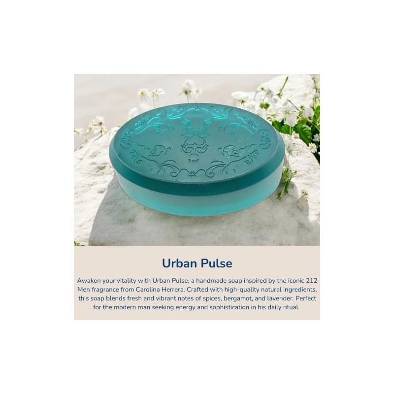 • Urban Pulse: Awaken your vitality with Urban Pulse, a handmade soap inspired by the iconic 212 Men fragrance. Crafted with high-quality natural ingredients, this soap blends fresh and vibrant notes of spices, bergamot, and lavender. Perfect for the modern man seeking energy and sophistication in his daily ritual. Experience a scent that is both dynamic and elegant.