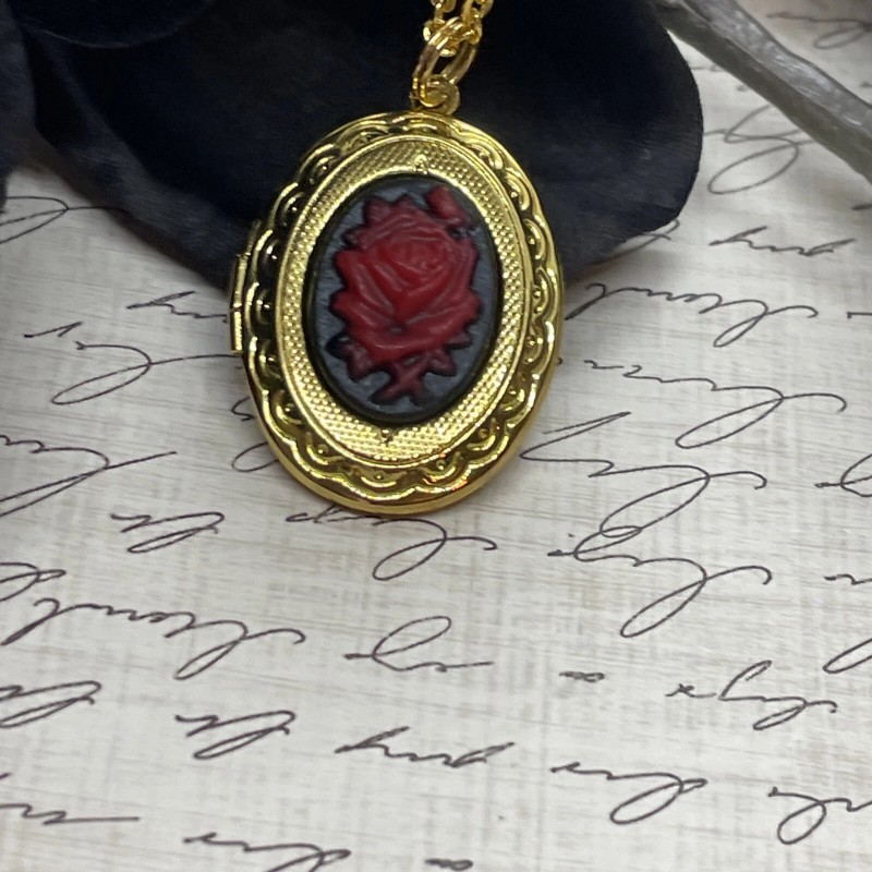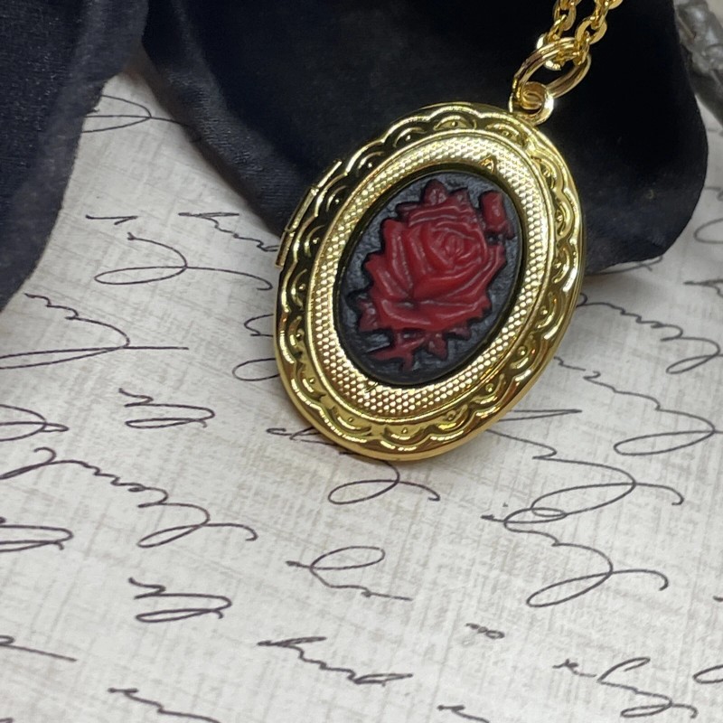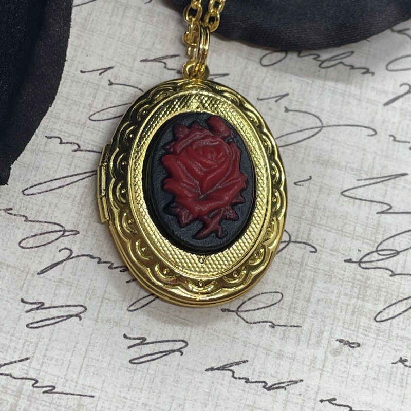 Fancy Fox Boutique Bright Gold Black Velvet Gothic Red Victorian Rose Locket Necklace Wedding