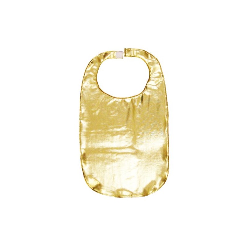 No danger of ruining your holiday or special event finery with this whisper light GOLD LAME adult bib. Measures 16.5" long from bottom of neck, and 13.5" wide. Velcro closure. MADE IN THE USA!! Fun and glamorous, perfect for home or restaurant. This bib is NOT waterproof, nor intended for heavy duty daily invalid feeding. CARE NOTE: Bibs may be laundered in cold water and hung dry, but do not attempt to spot clean: If rubbed, the gold will delaminate. Do NOT iron, fabric will melt.