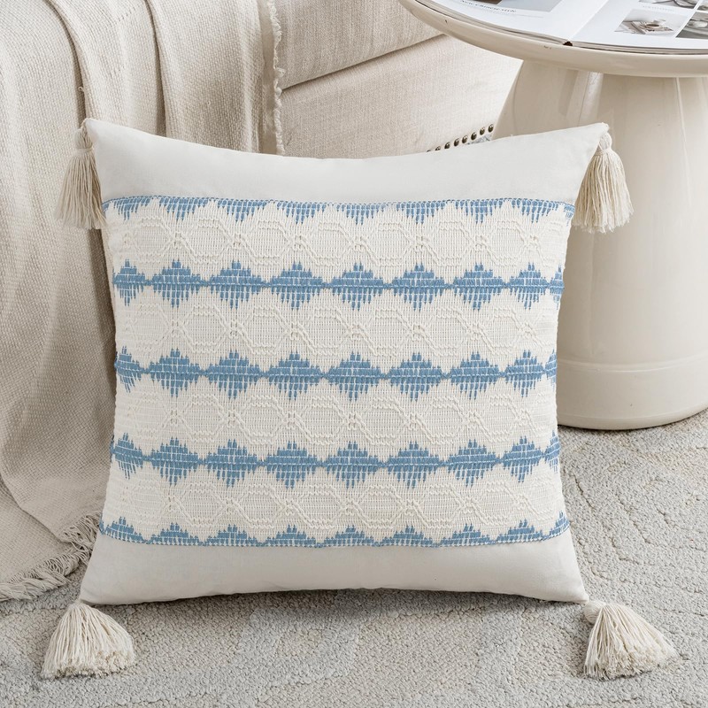 Fancy Homi Set of 2 Boho Light Blue Decorative Throw Pillow Cover 18x18 Inch for Couch Bed Sofa, Aesthetic Farmhouse Home Decor, Soft Cotton Cute Accent Macrame Woven Cushion Case with Tassels
