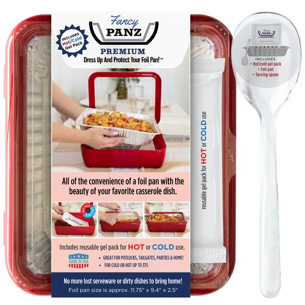 - VERSATILE SERVING OPTIONS: leave the clear lid on & lift the tab to help maintain food temperature, or remove the top & place it underneath as a trivet. Includes 1 Fancy Panz, 1 foil pan, 1 reusable serving spoon, & 1 reusable gel pack.