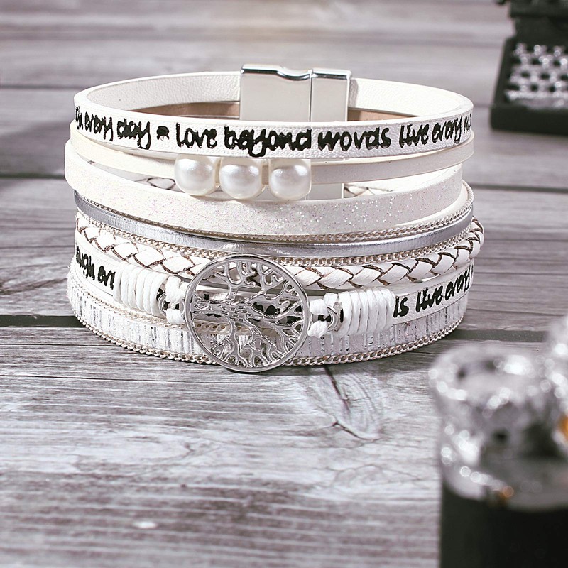 FANCY SHINY Tree of Life Leather Wrap Bracelet Inspirational Cuff Bangles Boho Pearl Bracelets with Clasp Unique Jewelry Gifts for Women Teen Girls(White)