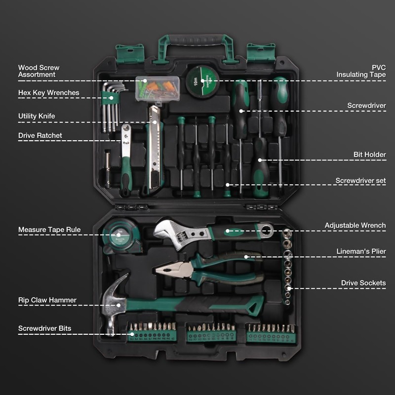 - 【Multi Purpose Tool Kit】This 100-piece tool set is suitable for most small repairs and home DIY projects. It's perfect for handymen, construction workers, repairmen mechanics, body shops and more, and is also an ideal tool set for home, garage and workshop.