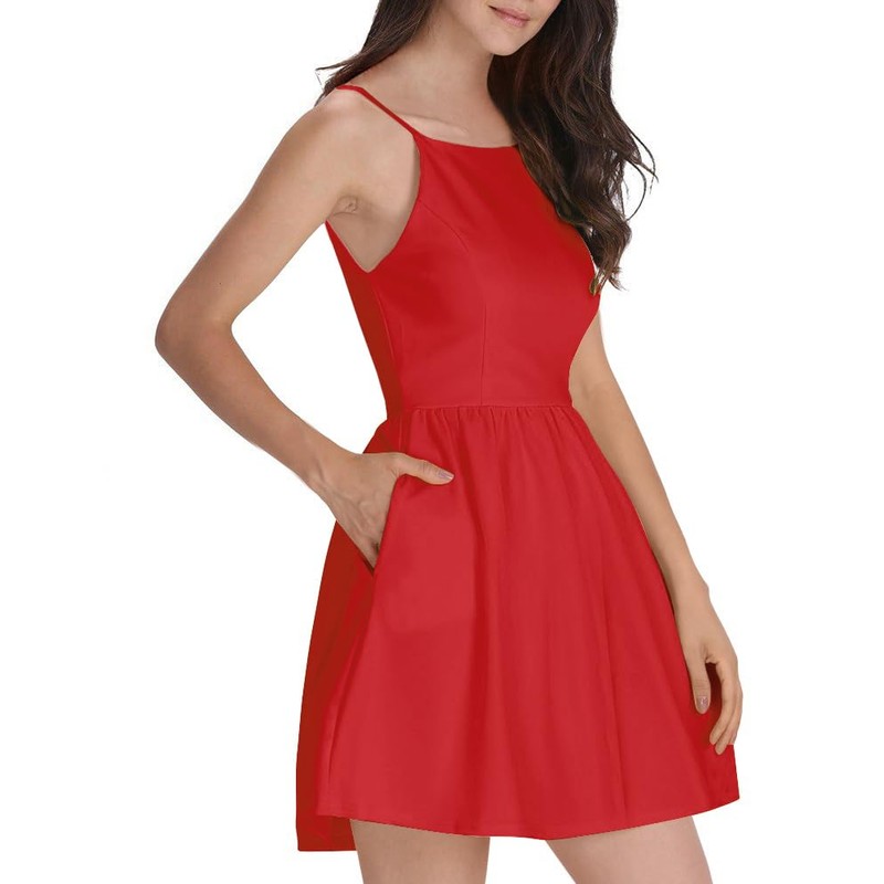 FANCYINN Women's Summer Short Dress Graduation Spaghetti Strap Backless Party Dresses with Pockets Dark Red XS