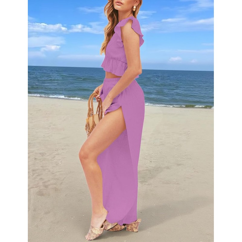 FANCYINN Womens 2 Pieces Outfits Deep V Neck Crop Top Side Slit Drawstring Wide Leg Pants Set Jumpsuits Purple L