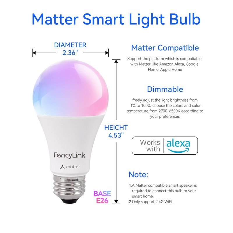 - 1.Powerful Smart Matter:Fancylink Matter smart light bulb is compatible with all Matter platforms. You can control all your smart home devices with a single app certified by Matter, reducing the need for multiple apps for different devices and upgrading your privacy security without cloud services.