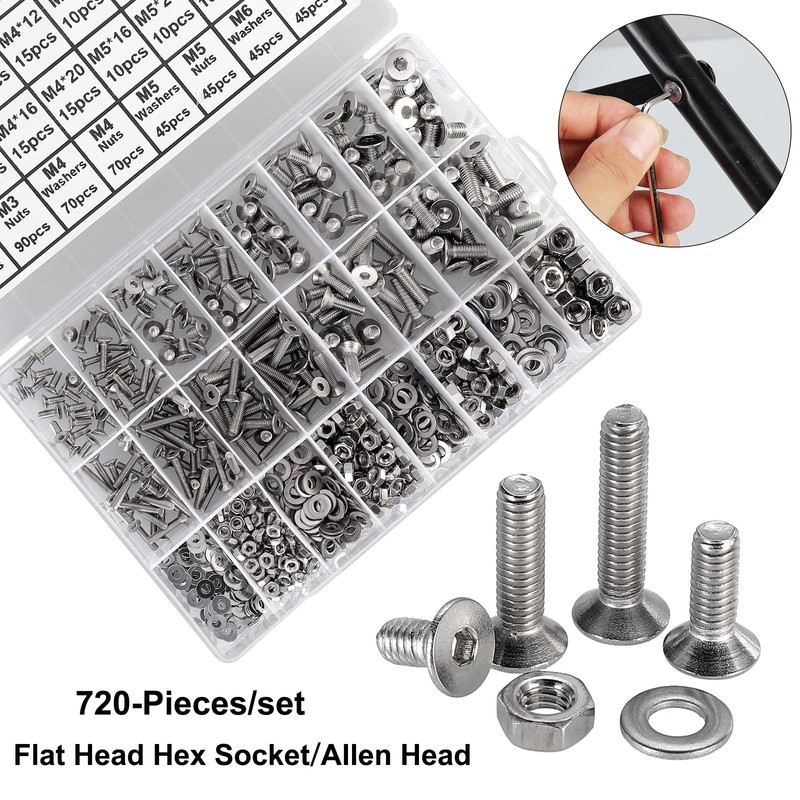 - đ©ăSet Includesă: 720Pcs different sizes and specifications of M3 M4 M5 M6 screws with matching nuts and flat washers meet different people's demands.