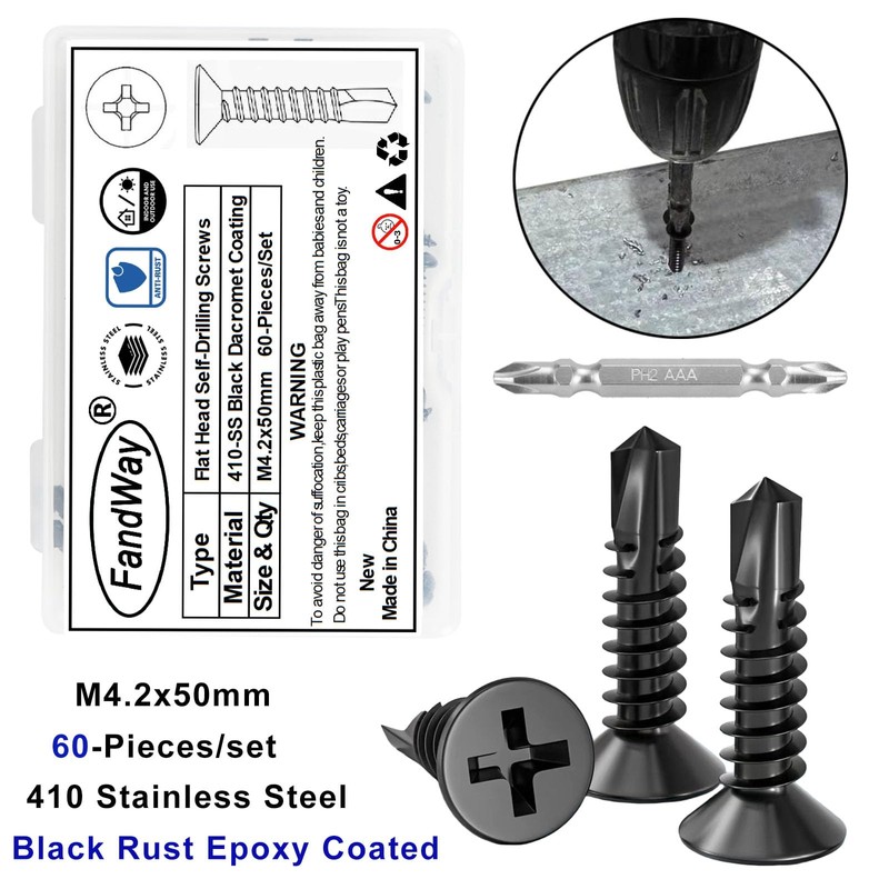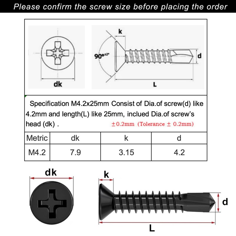 - Size selection: adjust the screw length to the material thickness. 1 sizes: M4.2 x 50 mm. --- Examples:(50mm for >6mm steel sheets)️ Note: For extremely hard/dense materials (e.g. hardwood, alloy steel), the self-drilling function may be limited - check material properties in advance.