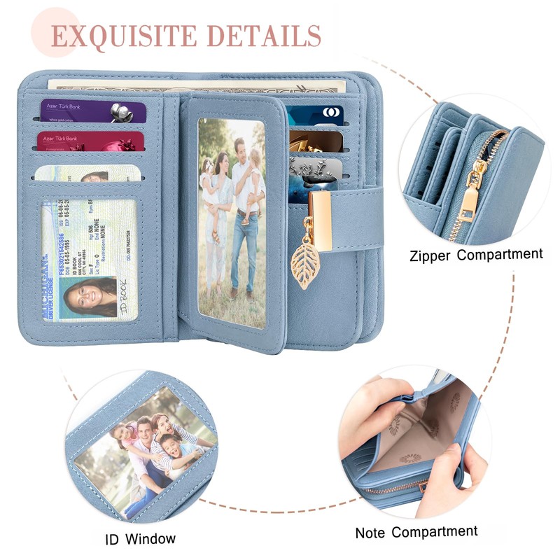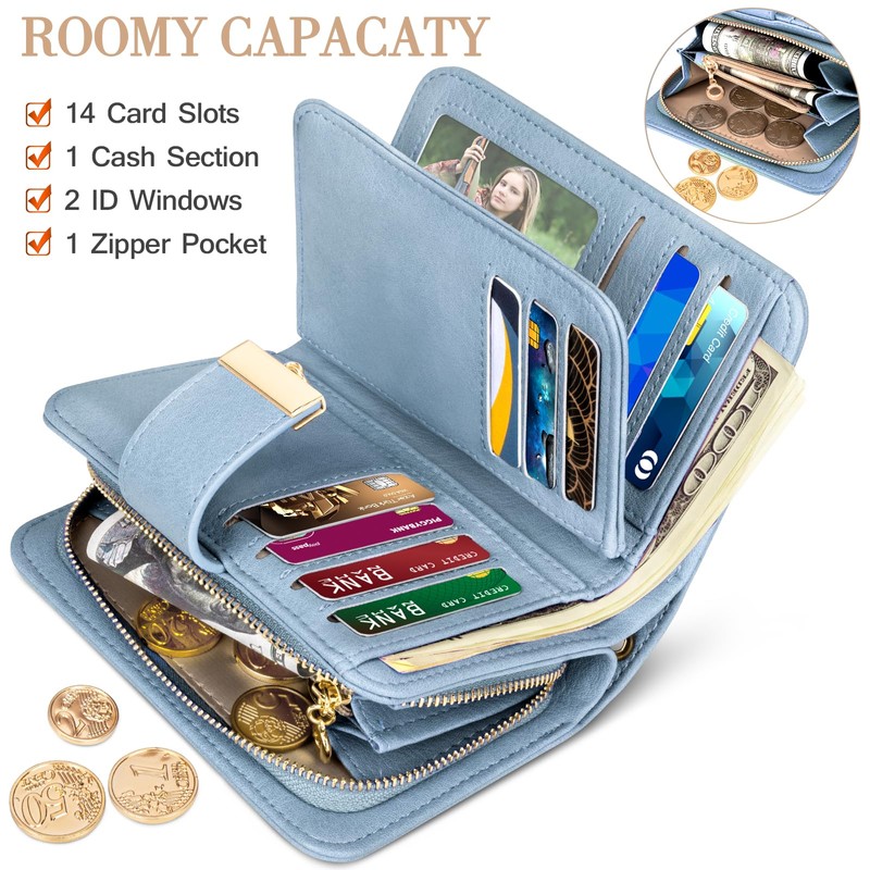 Faneam Women's Leather Wallet with RFID Protection, 14 Card Slots, Small Purses with Zip Chain and Lanyard, Retro light blue, Retro